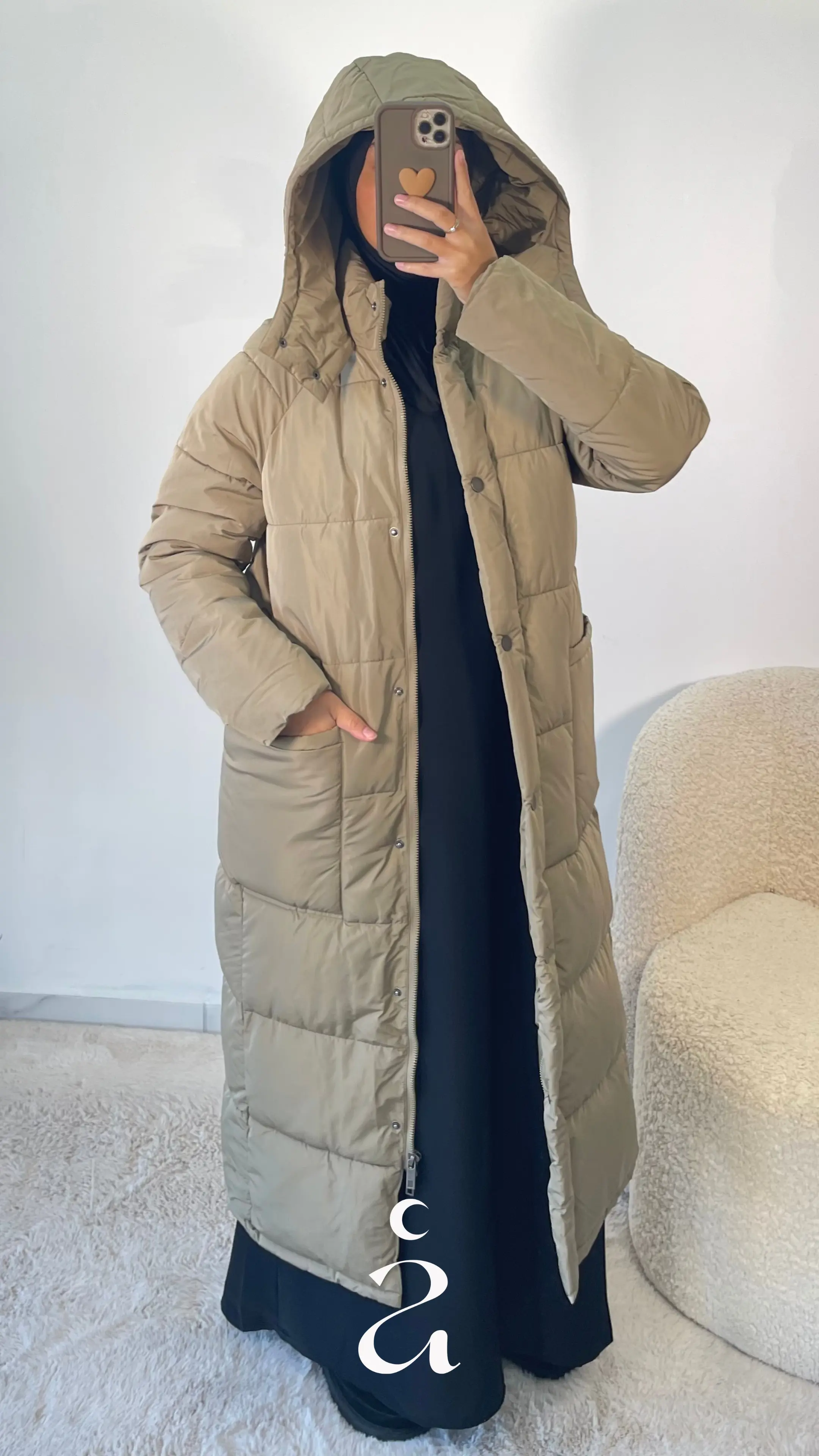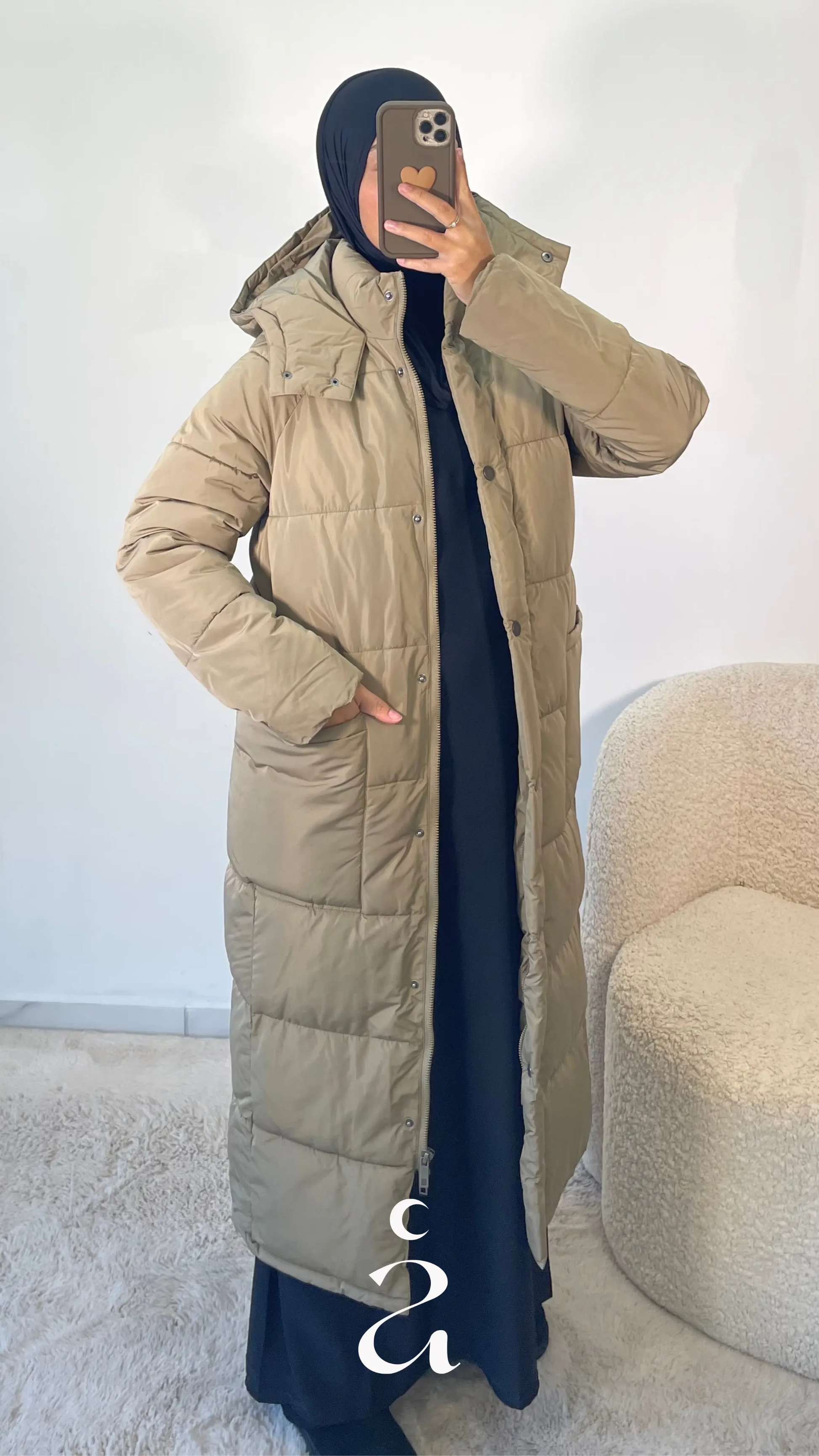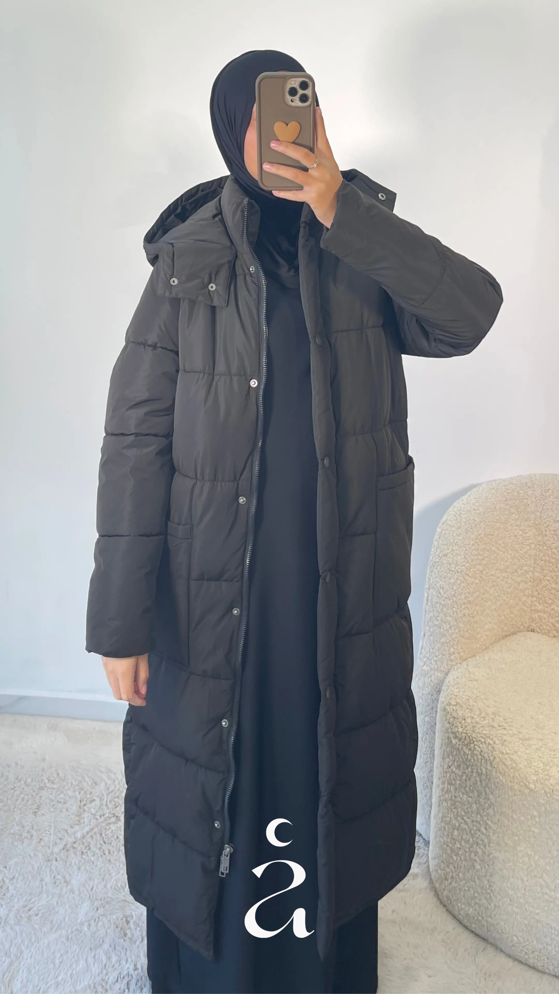 La doudoune longue avec capuche Alma est conçue pour vous offrir chaleur et confort tout en préservant un style pudique et raffiné. Sa coupe droite et ample enveloppe la silhouette sans la marquer, parfaite pour accompagner vos abayas ou ensembles en hiver.